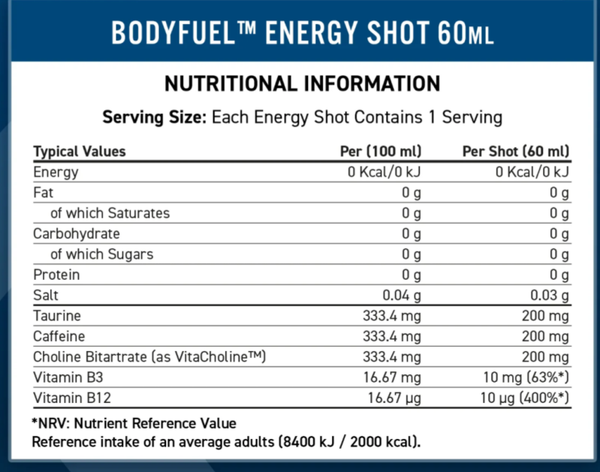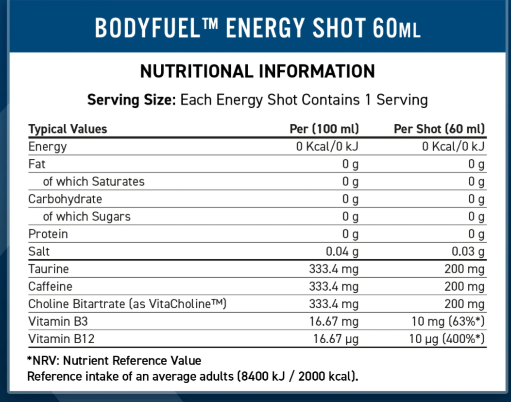 A compact 60ml energy shot with 200mg of caffeine, taurine, VitaCholine™, and B-vitamins to boost focus, energy, and brain function, perfect for on-the-go use and retail displays.