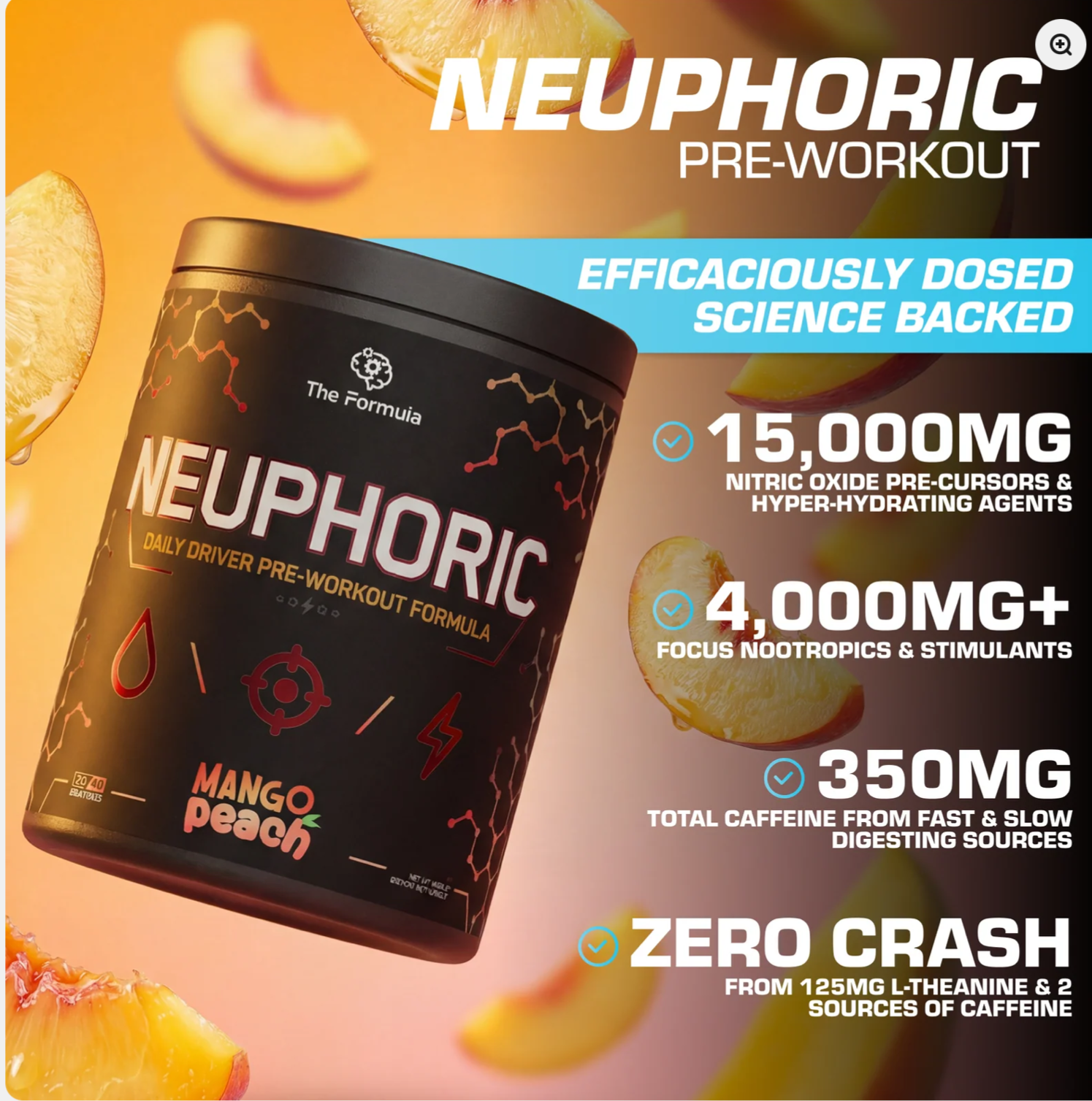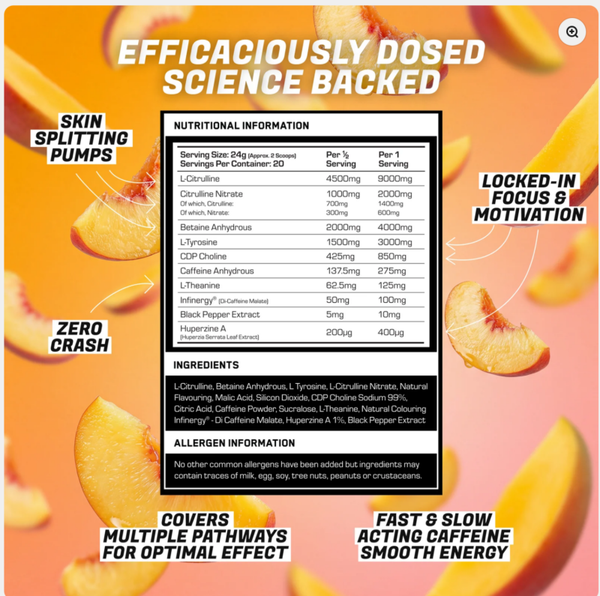 NEUPHORIC delivers intense, skin-splitting pumps with 15,000mg of nitric oxide precursors and hyper-hydrating agents, driving unparalleled blood flow and muscle volume. Nearly 4,000mg of nootropics and stimulants provide laser-sharp focus, deep motivation, and sustained energy without the crash – thanks to a balanced blend of fast and slow- release caffeine, plus 125mg of L-Theanine.