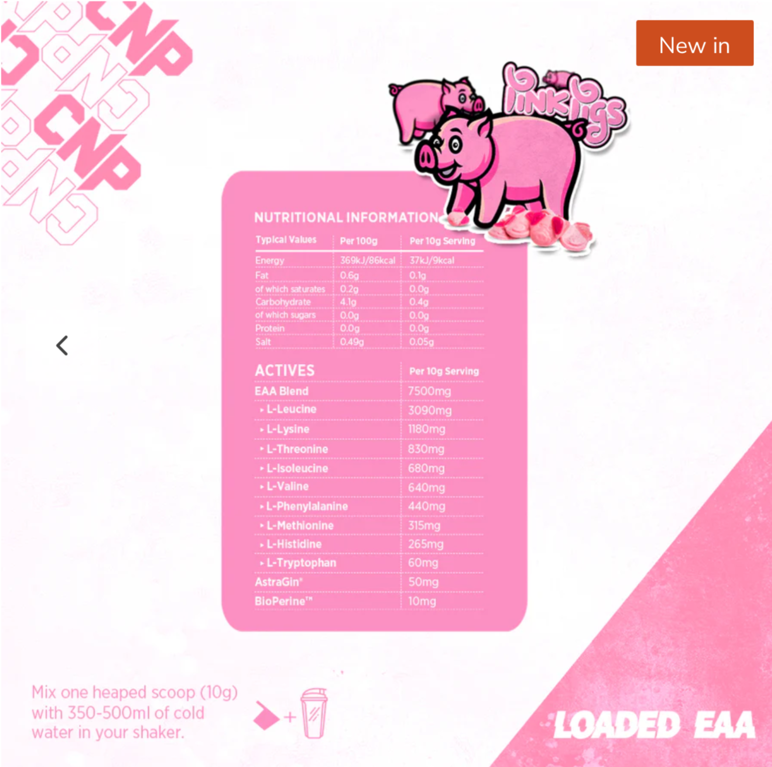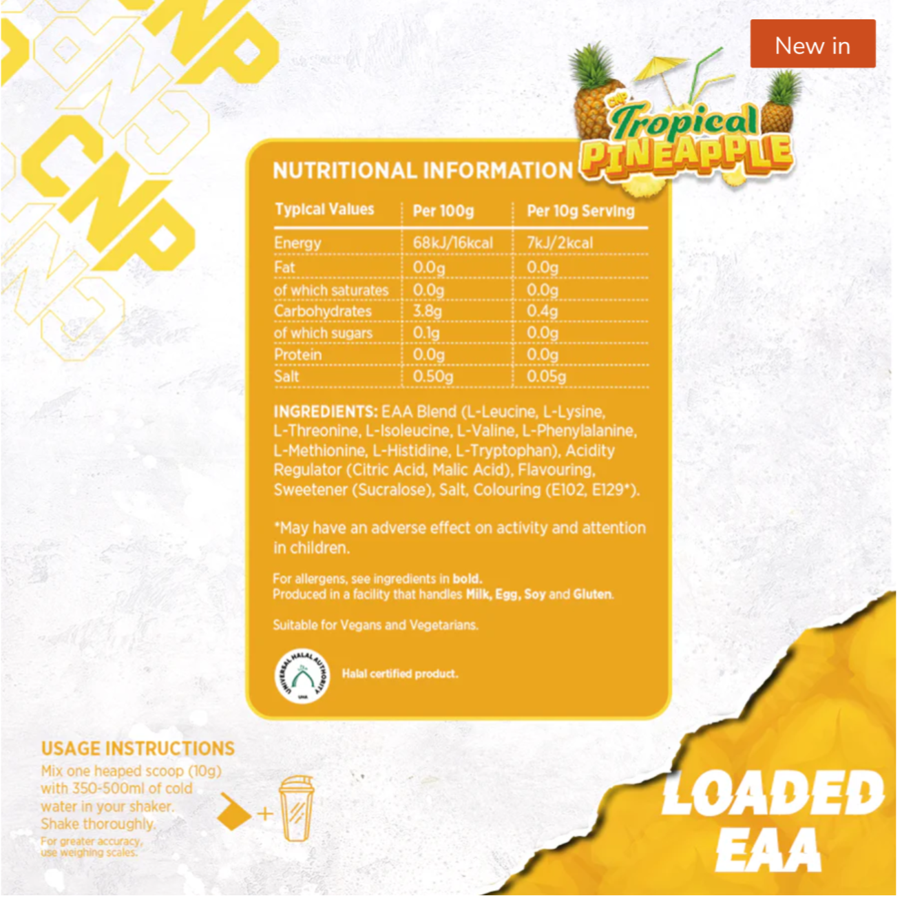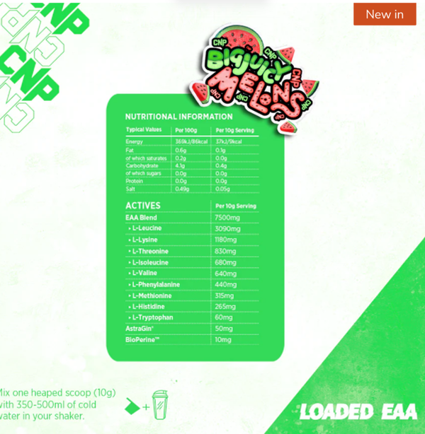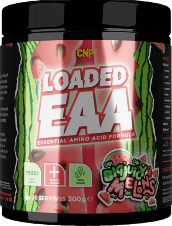 CNP Loaded EAA’s are the perfect combination of a highly functional product and some of the best, thirst quenching sweet inspired flavours on the market. Our premium EAA’s have been formulated to be specifically high in Leucine and to provide you with all the branch chain and essential amino acids (BCAA’s and EAA’s) as part of a premium recovery blend which can be used pre / intra / post workout, or any other time of the day. Being packed with EAA’S, it enhances recovery and performance, allowing it to be a versatile product taken by anyone who takes part in exercise, from hardcore lifters in the gym, CrossFitter’s, strongmen and endurance athletes. Although EAA’s can be acquired from food, there is a real opportunity to maximise intake and therefore recovery by using an EAA supplement, something athletes have been doing for years with great results.